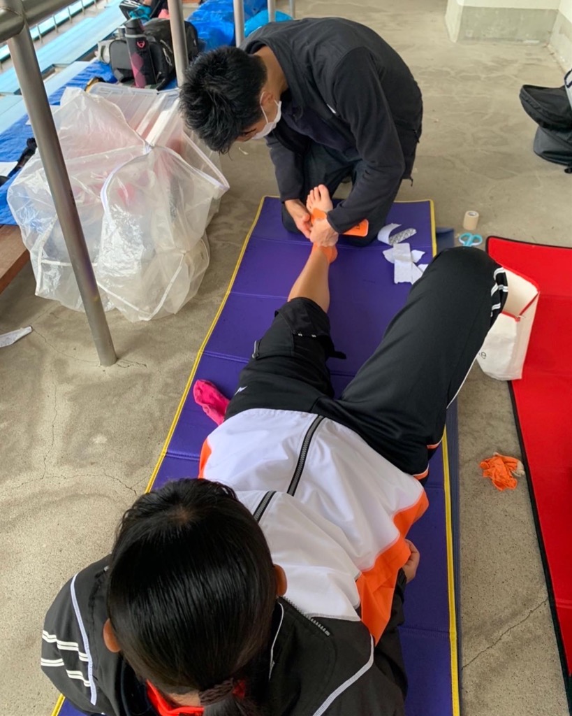 試合前にテーピングを巻いたり、身体のコンディショニングを行い